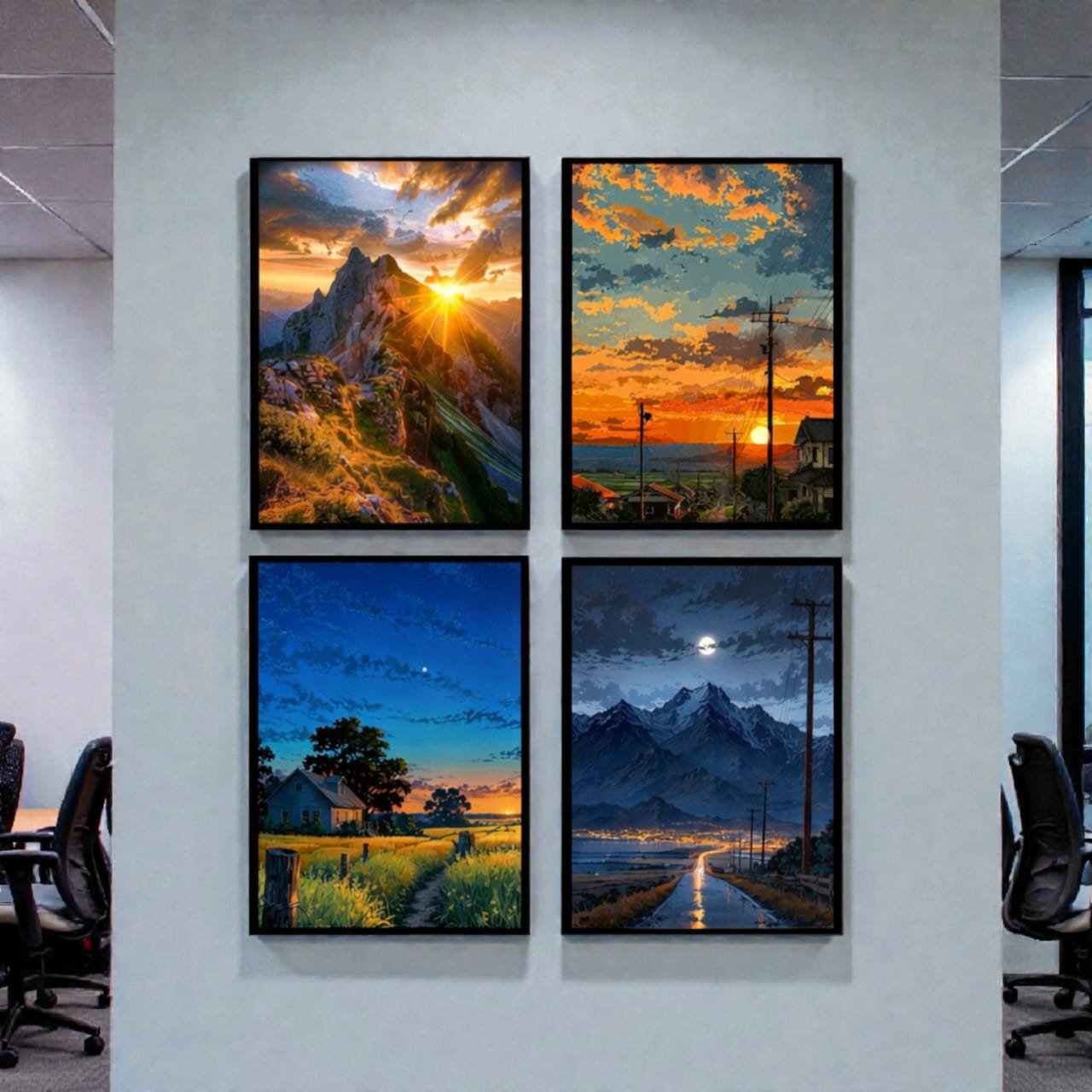 To get the most out of your Aesthetic Nature Scenery Wall Art Frames, we recommend hanging them in a “Grid Layout” (2×2) with a 1-inch gap between each frame. This creates a large, unified window effect on your wall. If you are using the sticky variant, ensure the wall is clean and dry before applying the adhesive for maximum grip.