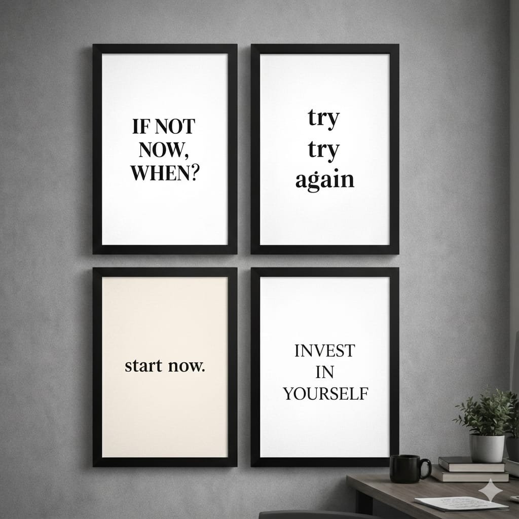 Each frame features carefully selected success-driven quotes like “If Not Now, When?”, “Try Try Again”, “Start Now”, and “Invest In Yourself.” These statements are not just decoration — they are daily reminders to take action and build a better future.