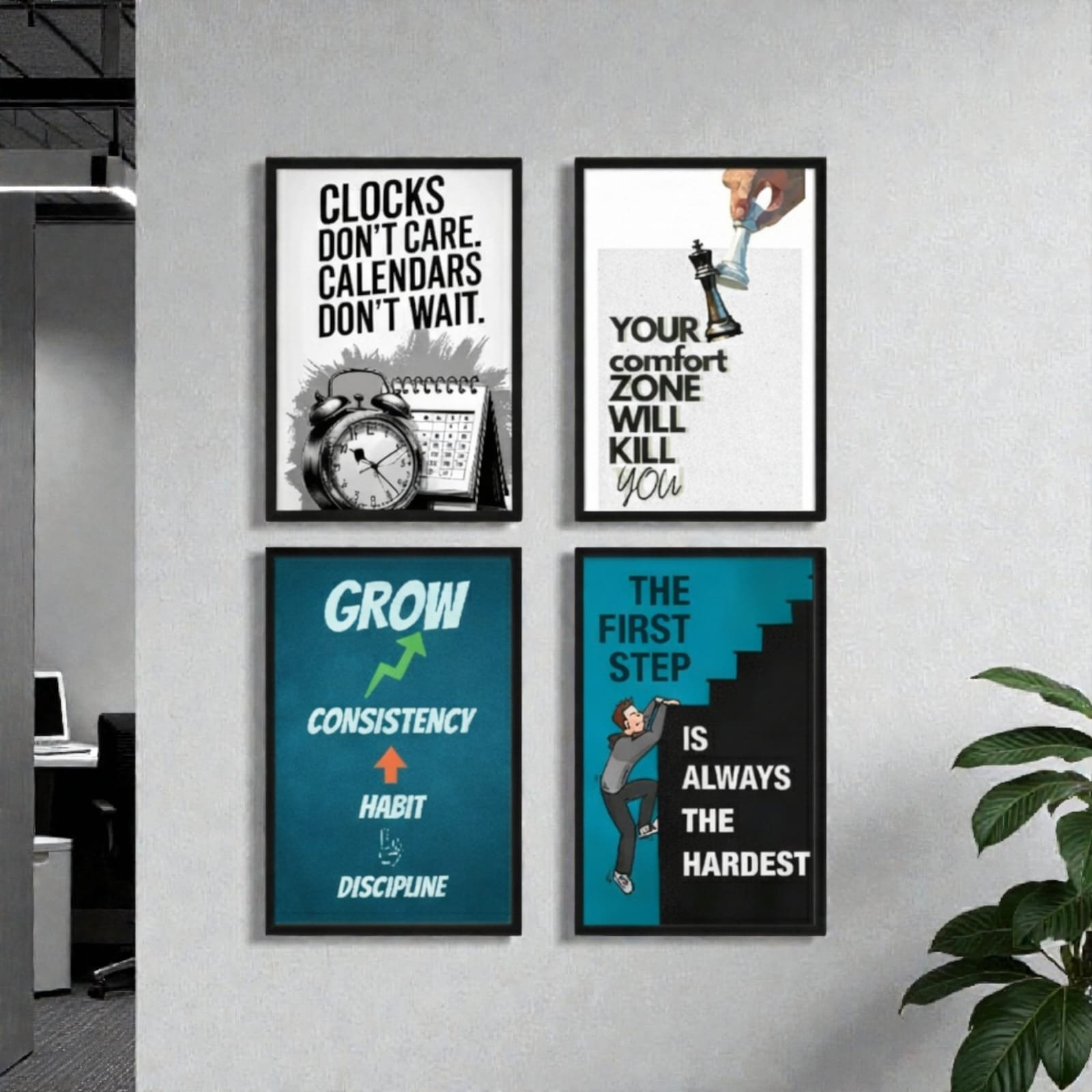 Elevate your productivity and transform your workspace with the Shehzada Decor Pack of 4 Motivational Wall Frames. This curated set is more than just decoration; it is a visual success roadmap designed for entrepreneurs, students, and professionals. Each frame is meticulously crafted to serve as a daily reminder of discipline, time management, and the courage to step outside your comfort zone.